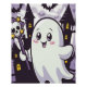 A charming and whimsical poster featuring a cute ghost holding a spooky magic wand adorned with a skull. The background showcases a haunted castle with towering turrets and bats flying around, all enveloped in a soft purple hue. This delightful blend of cute and spooky elements makes it a perfect addition to Halloween decor or to bring a playful mystery to any space.