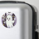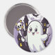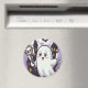 A charming and whimsical poster featuring a cute ghost holding a spooky magic wand adorned with a skull. The background showcases a haunted castle with towering turrets and bats flying around, all enveloped in a soft purple hue. This delightful blend of cute and spooky elements makes it a perfect addition to Halloween decor or to bring a playful mystery to any space.