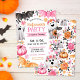 This Halloween Party & Trick or Treating design features cute ghosts and adorable bats with pink and orange pumpkins and florals. It is ideal for a little girl's halloween party. You can customise all the text for your event. On the back of the invitation is a cute pattern with ghosts, bats, pumpkins and florals. See the whole matching collection.