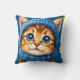 Adorable ginger cat face printed on a soft decorative pillow wearing a blue knit hood. Charming, whimsical home decor perfect for nurseries, kids' rooms, cosy living spaces, gifts, and pet lovers.