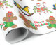 This festive Christmas gift wrap features cute holiday images, including a toy rocking horse, a brightly coloured Santa Claus, and a gingerbread man and woman. It also includes the text in green and red, "Merry Christmas." Festive, unique, and colourful! Cute! Kids will love it!