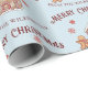 This festive custom Christmas or holiday wrapping paper features a wholesome gingerbread theme on a soft, baby blue coloured background. An image of a gingerbread house is pictured in the centre, with a cute little gingerbread man to the left. Little red snowflake cookies are snowing from the sky. A sample Merry Christmas greeting is printed above the tree and a sample family name is printed below. You can personalise the gift wrap to include your own custom name or text.