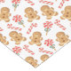 This fun Christmas table runner has a pattern of gingerbread man cookie images, red and white candy canes, and stick candies. The images are placed on a white background. Appealing to kids of all ages for the Holiday season!