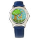 Colourful giraffe art on kid's watch with leather strap available in various colours for boys or girls.