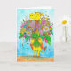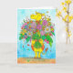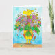 A cute cartoon giraffe is holding a huge bouquet of various flowers and smiling at the viewer. A cute, wholesome card to put a smile on whoever receives it.