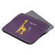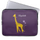Personalised purple giraffe laptop sleeve for a girl with a cute giraffe nibbling on a violet flower and holding some flowers with its tail while skating with roller skates which wheels are made of flowers, on dark purple background. This cute personalised laptop sleeve will make a great gift for someone who loves giraffes, cartoon animals and cute illustrations.