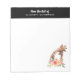 A notepad with a cute drawing in watercolors of a mom and baby giraffe. The mother giraffe is resting her head on top of the baby giraffe, loving and adorable. Pretty pink, yellow, green watercolor flower bouquet placed underneath this darling pair. A black border along the top with your personalized name and text which says" from the desk of".