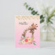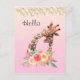 A hello postcard with a cute drawing in watercolors of a mum and baby giraffe. The mother giraffe is resting her head on top of the baby giraffe, loving and adorable. Pretty pink, yellow, green watercolor flower bouquet placed underneath this darling pair. Decorative leaves hang down from the top.