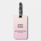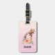 A luggage tag with a cute drawing in watercolors of a mum and baby giraffe. The mother giraffe is resting her head on top of the baby giraffe, loving and adorable. Pretty pink, yellow, green watercolor flower bouquet placed underneath this darling pair. A gradient background created using a soft pink colour blending into light peachy orange colour.