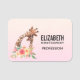 A name tag with a cute drawing in watercolors of a mum and baby giraffe. The mother giraffe is resting her head on top of the baby giraffe, loving and adorable. Pretty pink, yellow, green watercolor flower bouquet placed underneath this darling pair. A gradient background created using a soft pink colour blending into light peachy orange colour.