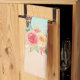 A kitchen towel with a cute drawing in watercolors of a mum and baby giraffe. The mother giraffe is resting her head on top of the baby giraffe, loving and adorable. Pretty pink, yellow, green watercolor flower bouquet placed underneath this darling pair. A gradient background created with a delicate turquoise blue colour blending into a sandy brown colour.