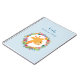 A personalised spiral notebook with an illustration of a cute smiling giraffe face, surrounded by a wreath of tropical watercolor flowers. Colourful and cute.