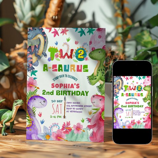 Cute Girl Dinosaur 2nd Birthday Invitation