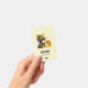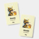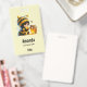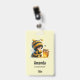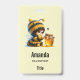 Name tag with a cute image. A girl in a crocheted bee costume with a bee by her side. Watching over a jar of honey.