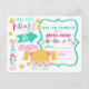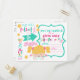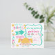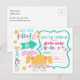 Here's a cute and colourful postcard girls' slumber party invitation. It features a blonde pigtailed little girl with pink bunny rabbit slippers in front of a teal bordered invitation form. On the left side of the form and above the girl is stylised text that says "up all Night", "No Boys Allowed", "Sleepover", and "giggle", along with some scattered gold stars. Colours used include teal green, pink, and gold. Fun! The back of the postcard has two text fields, one for your return address and one for any extra info you may need to include.