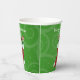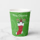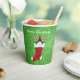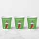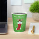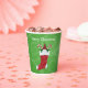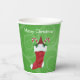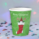 These paper cups are green with swirls and circles with a cute gnome with a white beard wearing a pointed red hat inside a red Christmas stocking with candy canes and holly leaves. Customise your text with the templates on the front and back.