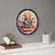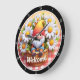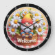 This charming round clock features an adorable gnome sitting in a woven basket filled with white daisies, all set against a red and white chequered background. A "Welcome" sign adorns the basket, adding a friendly touch. This whimsical clock is perfect for a kitchen, nursery, or as a cheerful accent in any room, bringing a delightful and inviting atmosphere.