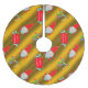 A very cute gold and red Christmas tree skirt with a whimsical pattern of little Christmas elves (or gnomes, or Santa's Helpers!) all with long beards and pointy red hats, with striped Christmas stockings and the traditional Christmas greeting of 'Merry Christmas', on a colourful golden metallic background to add some fun and colour to your Christmas tree for the holidays.