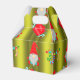A very cute green and red Christmas gift box featuring a pattern of adorable Christmas gnomes (or elves, or Santa's helpers) with red pointy hats and long bushy beards, on a colourful chartreuse green background. They're surrounded by Christmas signs wishing all a very Merry Christmas, candy canes and striped Christmas stockings.