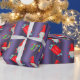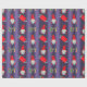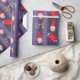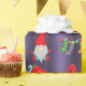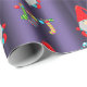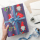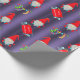A very cute Christmas wrap, featuring a pattern of little Christmas gnomes in red hats on a purple background. They're surrounded by colourful, striped Christmas stockings and 'Merry Christmas' greetings.