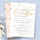 Adorable and cute baby shower invitation features sprinkled stars along the top and the word "twinkle" in gold with modern serif typography. The back of the invitation is blush pink with sprinkled gold stars.