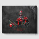 Cute Gothic Christmas Elf. At the centre of this magical setting stands a pointy-eared elf, her eyes sparkling in the light of the full moon like stars on a clear night. Her black and red dress gently sways around her slender frame, giving her an aura of elegance and mystery. The surroundings are adorned with ornate black and red Christmas decorations that seem like forgotten relics from another time. They frame the scene, giving it a gothic festivity that is both enchanting and eerie.