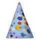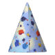 These graduation party hats are decorated with a scene of colourful graduation caps tossed into the air, shown against a blue sky with puffy clouds.
