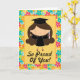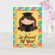 This adorable graduation card is perfect for high school graduates, college grads, kindergarten graduation and more. Cute girl graduate holding a diploma with brightly coloured flowered background has So Proud Of You sentiment.