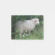 This awesome pad of post it notes features a photograph of a cute fluffy sheep. The sheep is surrounded by wild flowers and long grass and is greedily eating some leaves. It has a thick white coat of wool and a cute black nose.