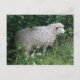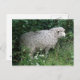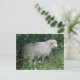 This cute postcard features a photograph of a cute fluffy sheep. The sheep is surrounded by wild flowers and long grass and is greedily eating some leaves. It has a thick white coat of wool and a cute black nose.