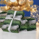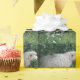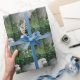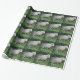 This beautiful wrapping paper features a photograph of a cute fluffy sheep. The sheep is surrounded by wild flowers and long grass and is greedily eating some leaves. It has a thick white coat of wool and a cute black nose.