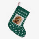 Give your favorite furry friend their very own Christmas stocking this holiday season. Personalize the dog Christmas stocking by adding your dog's name and photo with a pattern of white bones and snow against a dark green background.