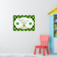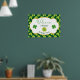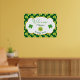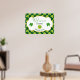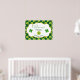 A birthday welcome poster with a cute repeating pattern with olive green clovers on a dark green background. A fancy vintage frame layered over top with your text inside. Frame has a faux gold foil border.