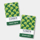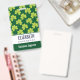 Personalised name badge with a cute repeating pattern of olive green clovers on a dark green background.