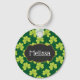 A personalised keychain with a cute repeating pattern of olive green clovers on a dark green background. A fancy vintage frame layered over top with your text inside. Frame has a faux gold foil border.