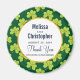 A wedding magnet with a cute repeating pattern with olive green clovers on a dark green background. A white circle with a faux gold foil border layered over top with your text inside.
