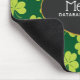 A mousepad with a cute repeating pattern with olive green clovers on a dark green background. A fancy vintage frame layered over top with your text inside. Frame has a faux gold foil border.