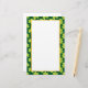 Stationery with a cute repeating pattern with olive green clovers on a dark green background. A white rectangle layered over top with a faux gold-foil border.
