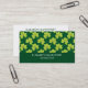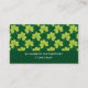 Business cards with a cute repeating pattern with olive green clovers on a dark green background.