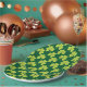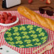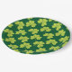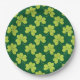 Paper plates with a cute repeating pattern with olive green clovers on a dark green background.