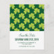 A save the date postcard with a cute repeating pattern with olive green clovers on a dark green background.