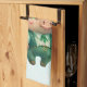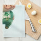 Kitchen towel with a cute green illustration of a pig standing up on his back feet, dressed in fancy hat, vest and pants.