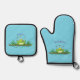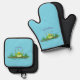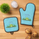 Cute green hungry frog cartoon illustration oven mitt & pot holder set