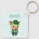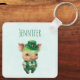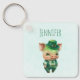 A key chain with a cute green illustration of a pig standing up on his back feet, dressed in fancy hat, vest and pants.