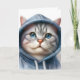 Cute watercolor artwork of a grey and white tabby cat wearing a blue hoodie to match those beautiful blue eyes on this blank greeting card.