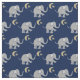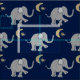 This beautiful fabric features a cute pattern of grey little elephants with a playfully lifted trunk and foot on midnight blue, alternating with golden yellow stars and moons.