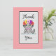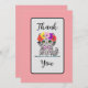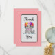 This thank you card has an adorable grey and black cat with big green eyes on it. His head is embellished with a row of red, pink, yellow and purple flowers. His neck is adorned with a cute pink ribbon.