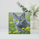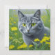 Cute ai grey cat with yellow eyes surrounded by flowers storybook style illustration.