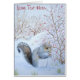 This cute winter wildlife snow scene shows a cute little grey squirrel sitting amongst the snow covered woodland shrubs and grasses, he's found a bush covered in red winter berries and is enjoying a nibble on his lucky find. This cute squirrel snow scene art card is very evocative of the cold winter months in the English countryside, but its cuteness can be appreciated all year round as well. The winter wildlife picture of this hungry little grey squirrel makes an original christmas note card and I'm sure this cute image will bring smiles to friends and family or whoever you send this note card to. This is customisable note card for you to personalise it with you’re own greeting and message on the front and inside this art card. The picture on this original note card is a produced from my original watercolour titled "A Winter Feast.”