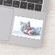 Decals with a cute Christmas photograph of a grey tabby cat playfully biting a red santa hat.